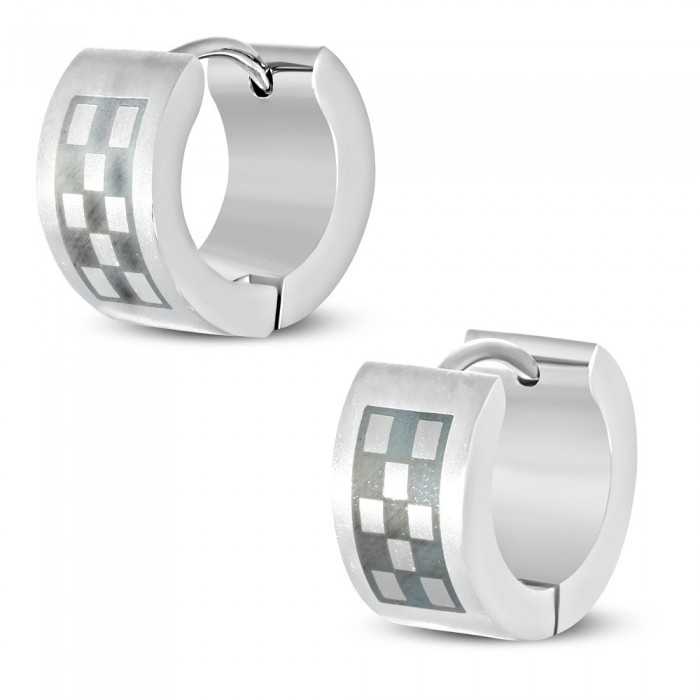 Un par de aretes de acero inoxidable decorado con un brazalete de damas de acero pulido que contrasta con los reflejos metálicos del anillo.