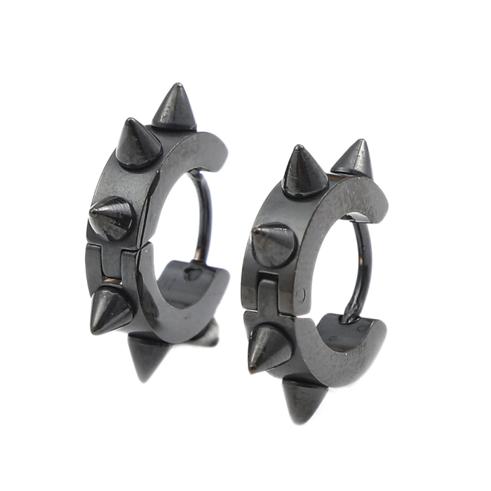 Pareja de hermosa pendientes para hombres perforado en acero negro de alta calidad por ionización. Estos hermosos anillos articulados están decorados cada uno de seis consejos cortos acertado. El tallo arqueado y seguro permite posicionarlo muy fácilmente. Una joya de moda que acompaña perfectamente a todos los trajes casuales.