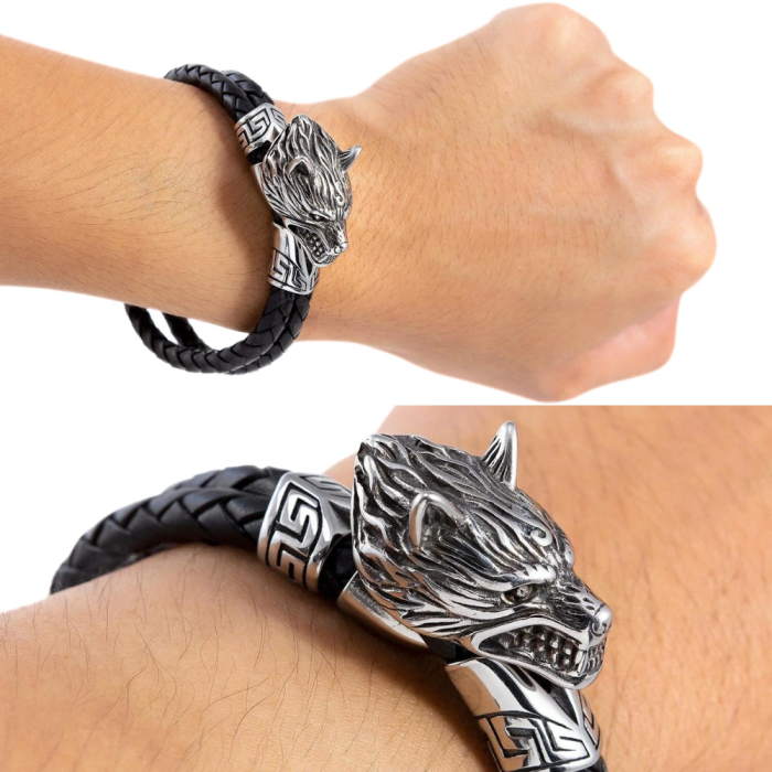 Este brazalete de cuero realuna clase inigualable que complementará perfectamente su aspecto masculino. Tiene dos cordones negros entrelazados sostenido y adornado por una hermosa cabeza de lobo de acero inoxidable que sirve de cierre insertando los lazos de cuero justo debajo. Así será fácil de usar o quitar. La cabeza de lobo que representa maravillosamente al lobo fenrir, este lobo tan venerado por los dioses nórdicos.