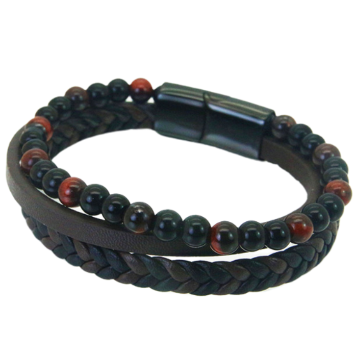Su tienda en línea de joyas masculinas les presenta este espléndido brazalete de cuero real con una clase sin igual que complementará a la perfección su aspecto masculino. Tiene tres filas: dos de cuero marrón y una tercera fila de piedras semipreciosas de ojo de tigre y perlas de ónice negro. Los tres cordones están sujetos por un fuerte cierre magnético de acero inoxidable negro. Una pulsera seductora que subraya la sensualidad del gesto del hombre refinado.