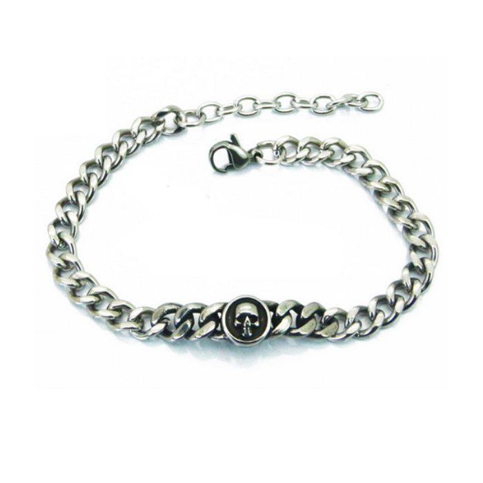 Esta espléndida pulsera de motocicleta de acero inoxidable fue diseñada con una cadena de malla cubana y una cabeza de muerto. El acero brillante ligeramente negro es un deleite para esta joya de calidad incomparable. El cierre de mosquete es seguro y muy práctico para llevar o quitar la pulsera rápidamente.
