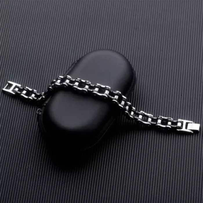 Presentamos este maravilloso acero inoxidable gourmet cuya estructura se asemeja a la de motocicleta cadena. Las piezas de acero inoxidable en color negro y plateado mezclado dieron a luz a esta pulsera que respira confianza y poder. Calidad de fabricación de alta gama garantizando durabilidad y resistencia, esto biker pulsera está destinado a todos los fans de motos y aventureros. Esto motocicleta cadena pulsera la píldora típicamente masculina y de moda que será maravilloso con un sujetador de cuero. El brazalete tiene un cierre seguro y prácticamente invisible gracias a su perfecta integración en la línea general, el cierre está diseñado para ser fácilmente manipulado.