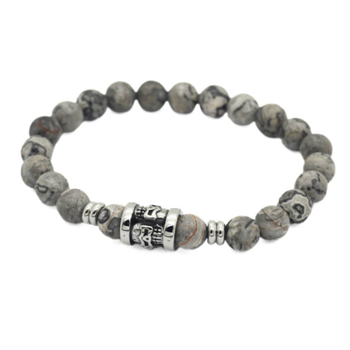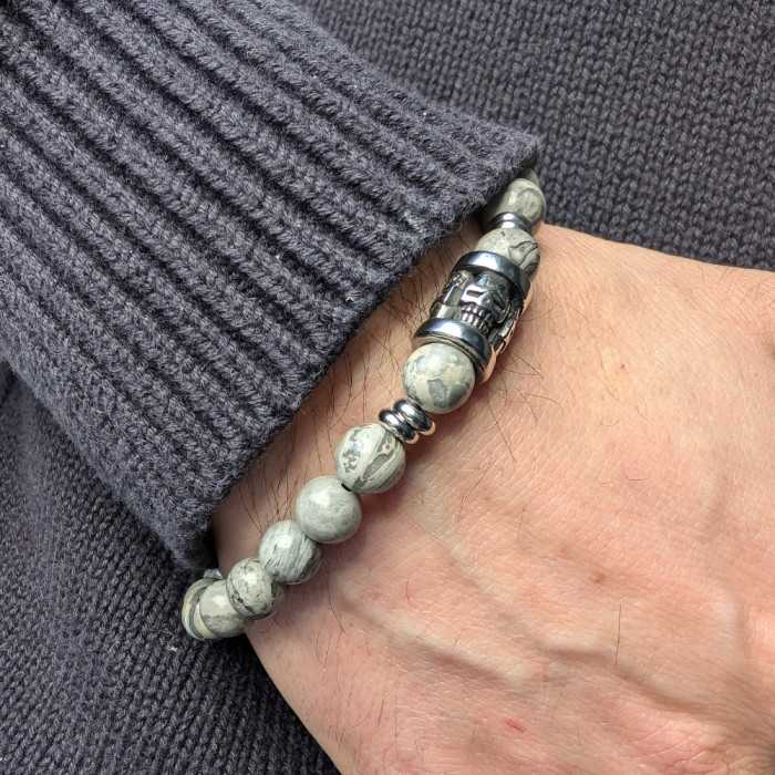 Estás buscando un pulsera para hombre que encarna estabilidad y protección añadiendo un toque de elegancia a tu estilo? Esto pulsera de ágata gris con cabeza de muerte, con sus patrones naturales y sofisticados, podría ser el accesorio perfecto para anclar sus energías y protegerlos de influencias negativas.