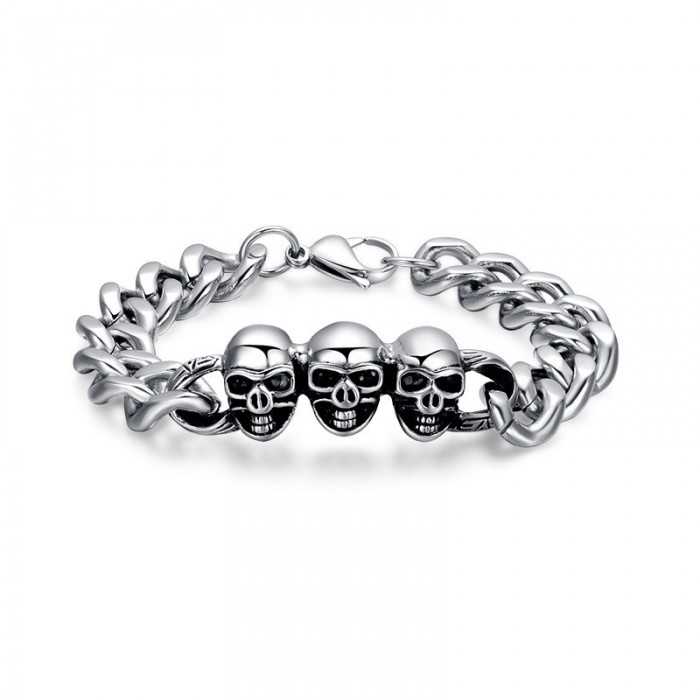 Una hermosísima pulsera de motociclista de acero inoxidable con un trío de cabezas de muerte atadas para siempre. El acero brillante negro es un deleite para esta joya de calidad incomparable. Las mallas cubanas componen este gourmet de acero brillante que acentúan la masculinidad de esta pequeña joya. Esta pulsera tiene un cierre discreto y seguro a la vez.