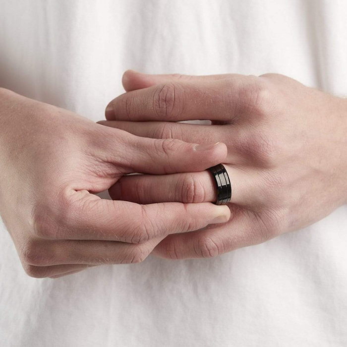 Realizzato in tungsteno, questo anello di alta qualità presenta un'ombra nera profonda con due belle scanalature.