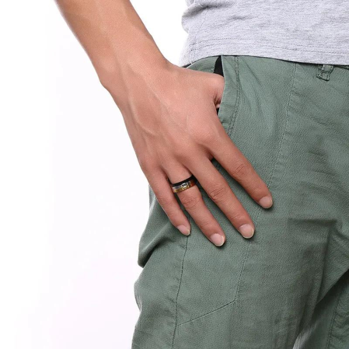 La luce gioca sulla vernice laccata di questo anello tricolore così come la pietra bianca leggera impostata sulla striscia centrale argento. L'interno dell'anello è completamente liscio, quindi sposare il dito perfettamente con la sensazione.
