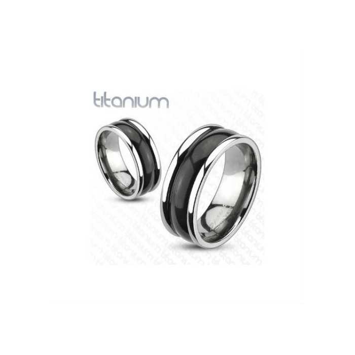 Le finiture estremamente pulite portano una raffinatezza incomparabile a questo bellissimo anello bicolore in titanio. L'anello è delimitato da bordi arrotondati alle magnifiche riflessi titanici che gli danno un rilievo visivo accentuato dalla banda centrale colorata nera da un impiallacciato per ionizzazione.