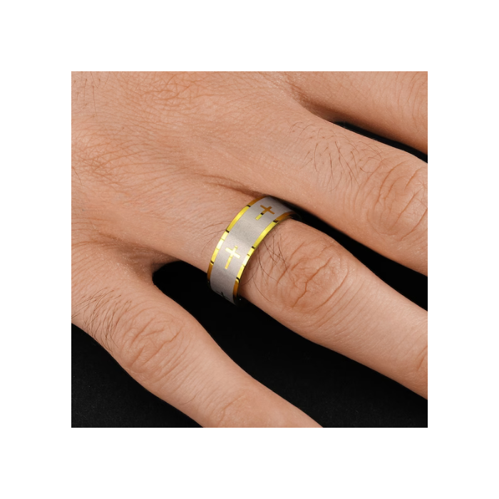 Progettato in acciaio inossidabile di alta qualità, questo anello bicolore è attraversato da croci latine dorate a oro fine su una striscia grigio spazzolato. Anche i bordi dell'anello sono dorati. L'aspetto spazzolato della band è una piacevole scelta estetica per l'occhio.