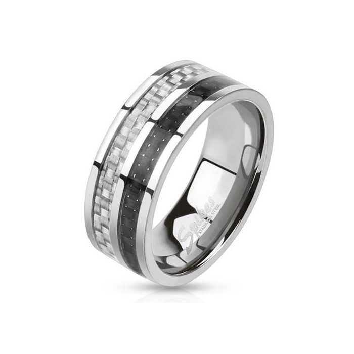 Anello in acciaio inox con 2 strisce in fibra di carbonio bianco e nero. 1 piqué di piccoli punti bianchi e 1 effetto damier grigio a strisce.