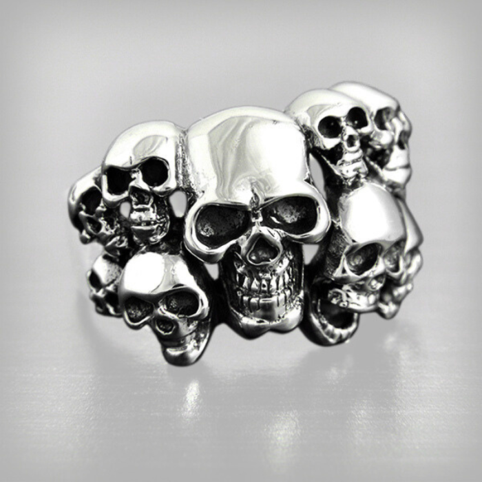 The teschi dei fedeli esercito di Morte sono scolpiti e riuniti su questo bellissimo anello. Questo anello per bici presenta una moltitudine di piccoli testa di morte realistico e molto dettagliato su uno sfondo leggermente oscurato. Il dito può essere visto attraverso i piccoli fori nell'anello, rendendo l'anello ancora più originale.