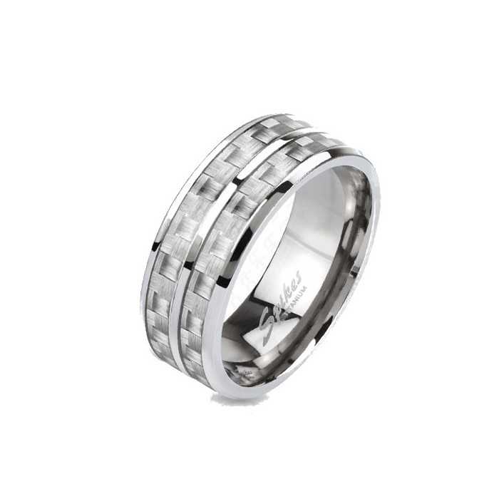 Anello in titanio di fascia alta con 2 nastri in fibra di carbonio che danno superbe sfumature miste, grigie e bianche, evidenziando così su ogni lato e al centro una tela stretta in titanio con luci metalliche.