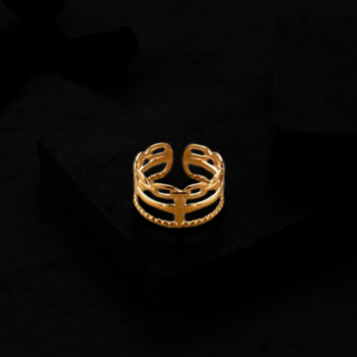 Alza la tua eleganza indossando questo sublime anello aperto per le donne sul dito. Questo anello donna in acciaio regolabile acciaio inossidabile oro con oro fine, è composto da 3 file collegati da una croce. Suono look si mescola perfettamente con altri anelli della nostra collezione di anelli regolabili. Si sublimerà la mano con il suo stile affermato, si lasci conquistare dalla sua composizione atipica e finitura dorata. Questo anello regolabile alla moda è fatto per una donna alla ricerca di una anello minimalista, qualità, facile da indossare ed economico. Ce anello multi-filare oro è regolabile, il che significa che si adatta a qualsiasi dimensione del dito. Si regola facilmente su tutte le dita premendo per stringere o estendere il supporto per ingrandirlo.