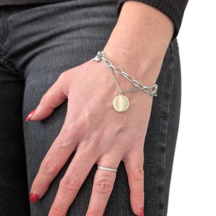ManBijoux presenta questo delizioso bracciale donna in acciaio acciaio inox con doppia catena di due fascino a forma di cuore e medaglione per personalizzare incisione secondo i vostri desideri su entrambi i lati per rendere questo braccialetto ancora più unico.