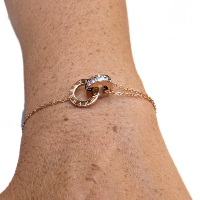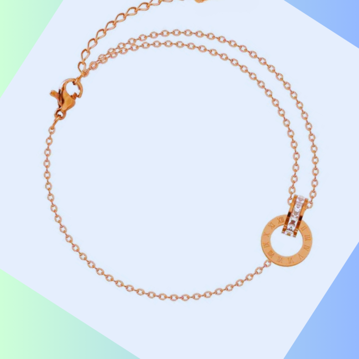 Scopri la sua bellezza braccialetto donna in acciaio inossidabile in oro rosa fino, composto da catene e due anelli attaccati l'uno all'altro: uno con pietre altri, l'altro con iscrizioni in numeri romani. Sì . Occuperà magnificamente il polso su cui è posto. Questo braccialetto da donna a buon mercato è perfettamente regolabile grazie alla piccola catena di regolazione. Questo braccialetto donna ha una chiusura in muschetto, sicura e discreta allo stesso tempo, consentendo così di regolare come si desidera. Questo splendido braccialetto si inserirà splendidamente nel polso su cui è appeso. Simbolicamente, questo braccialetto rappresenta perfettamenteunione, la sincerità, la fedeltà e l’amore eterno.