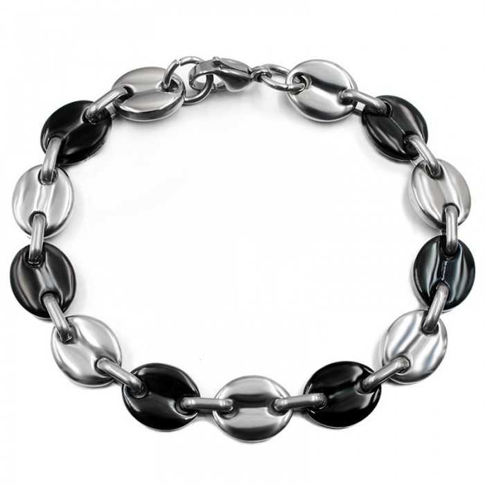 Lasciatevi sedurre dal classico e immutabile fascino di questo braccialetto bicolore grani di caffè di acciaio colore argento e nero, un gioiello immutabile con un design raffinato. Sulla base di gioielli tradizionali braccialetto chicchi di caffè nero e denaro uomo di una larghezza 10 mm simboleggia ricchezza, forza e legame con le radici. E' una cosa molto popolare di recente. La sua bellezza larghe maglie di caffè indosserà il tuo look di eleganza, si adatta perfettamente a tutti i tuoi abiti, in grado di seguirti per anni!