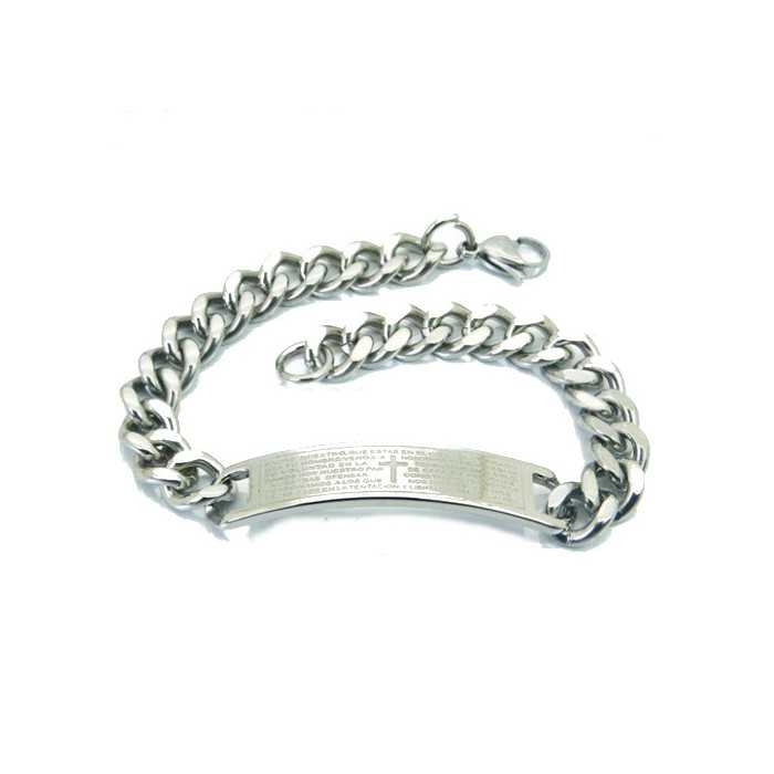 Maglia cubana gourmette con piastra posteriore in acciaio inox personalizzabile che chiude con una chiusura sicura e discreta di pecore alla volta. Sul lato recto della placca, viene stampato un estratto della preghiera del nostro padre in lingua spagnola punteggiato dal famoso "Amen".