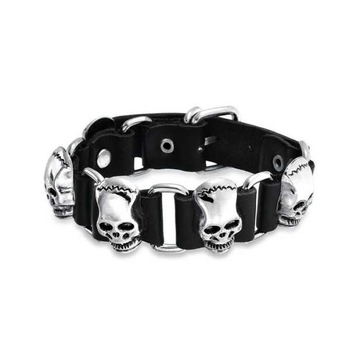 Ecco un vero e proprio bracciale in pelle nera realizzato in loop di morte in acciaio inox e teste. Questo braccialetto ti porterà un vero tocco di virilità al polso. La chiusura di questo braccialetto è conveniente come un anello di cintura con 4 posizioni possibili per regolarlo al polso meglio. Questo bracciale è quindi regolabile da 19cm a 25cm, che può quindi facilmente soddisfare qualsiasi tipo di polso.