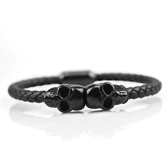 La vostra boutique online manbijoux è orgogliosa di presentarvi questo splendido braccialetto di pelle genuina con due teste di morte consituanti il pezzo chiave del braccialetto. Questo braccialetto ha una classe senza pari che perfezionerà il vostro look maschile. Alleanza sublima di una pelle nera di alta qualità con un lussuoso acciaio di colore nero, questo braccialetto attirerà gli occhi. Questo bracciale presenta una potente chiusura magnetica in acciaio inossidabile color nero che facilmente clip. Il design semplice ma audace di questo bracciale si adatta bene alla maggior parte dei tipi di abbigliamento, rendendolo un gioiello che può essere indossato ogni giorno in ogni occasione.
