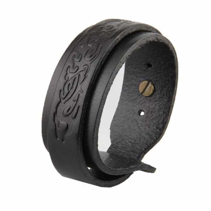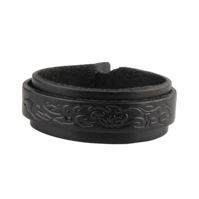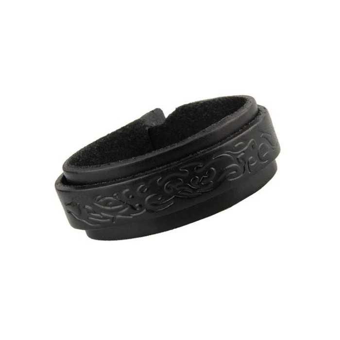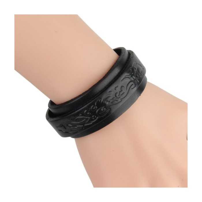 Eccone uno cinturino in pelle nera di forza con un modello tribale e con un morsetto di pressione. Questo braccialetto è regolabile, il che significa che può adattarsi a qualsiasi dimensione del polso. Un braccialetto che sicuramente piacerà un biker o biker. La sua larghezza è larga 25mm e una lunghezza totale di 20cm. È destinato a polso del piccolo uomo, si può leggermente regolare al polso, grazie al suo sistema intestinale, come una cintura reale. Può essere adattato a una misura del polso tra 17cm e 19cm.