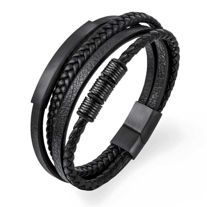 Braccialetto uomo cuoio nero Quattro righe e cilindri Placca di acciaio inossidabile da personalizzare