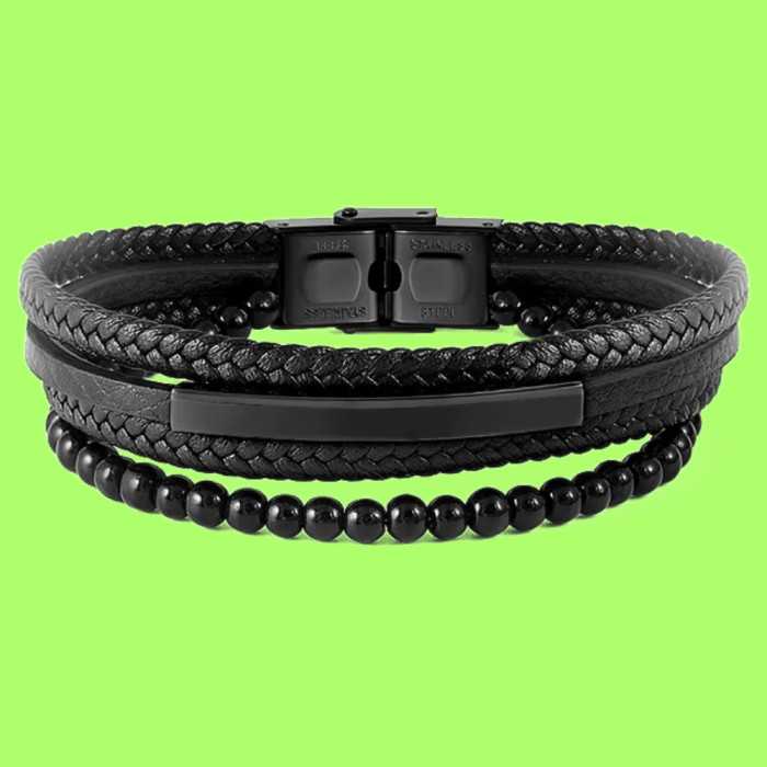 Braccialetto Maschile Multi-Rang Black Leather e Black Stainless Steel Plate Personalizzabile