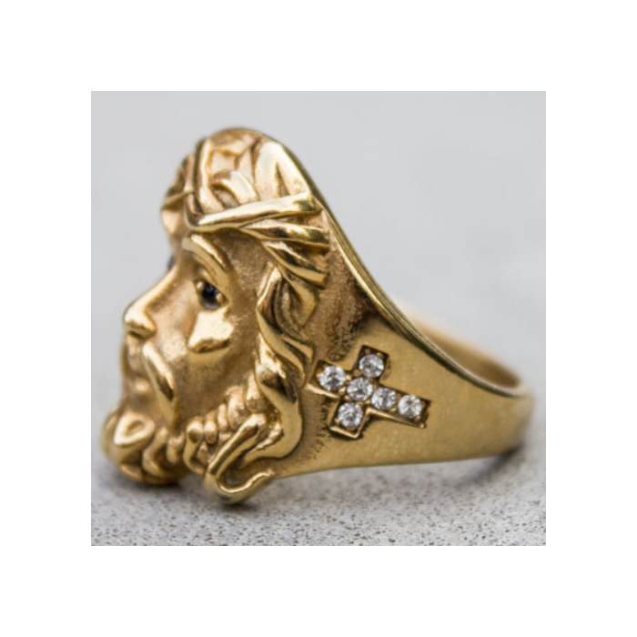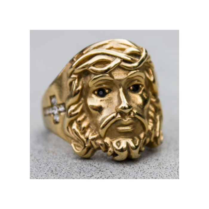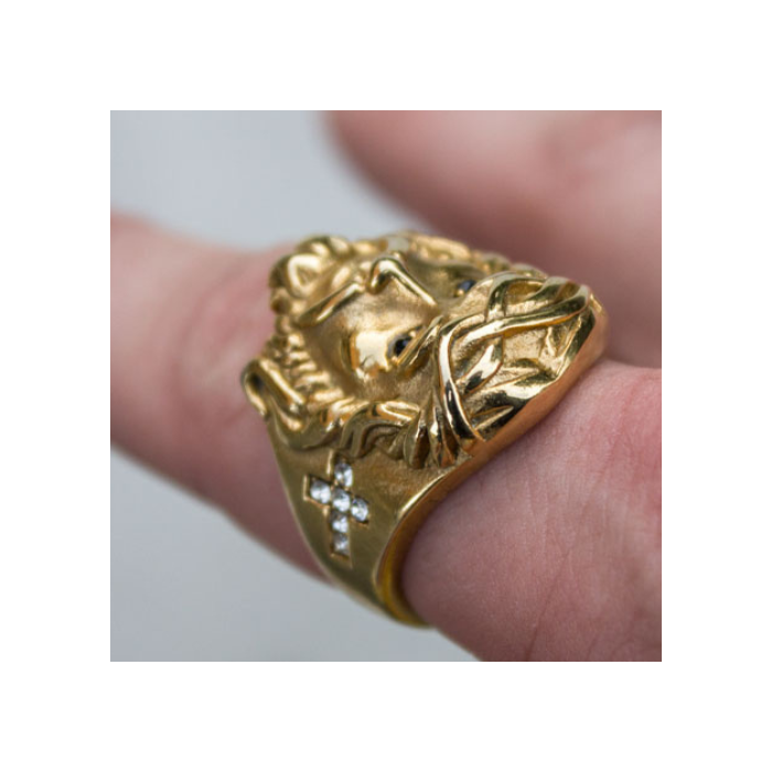 Questo anello anello da uomo acciaio inossidabile oro con oro fine è una meravigliosa rappresentazione del volto di Cristo. Il Volto di Gesù è accuratamente scolpito in rilievo. Su ogni lato è impostato di falsi diamanti di ossido di zirconio che formano un rendering incrociato cattolico tributo a Gesù Cristo. Smartly built, questo anello gode di un alto livello di finitura e materiale di qualità. Questo anello di jesus aggiungere un tocco di lucentezza al vostro aspetto.