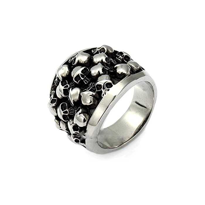 Anello cavaliere in acciaio inossidabile ricoperto da uno sfondo nero che accoglie teschi di testa morta. Questo anello per l'uomo è progettato per essere notato e fatto tutto per esso.