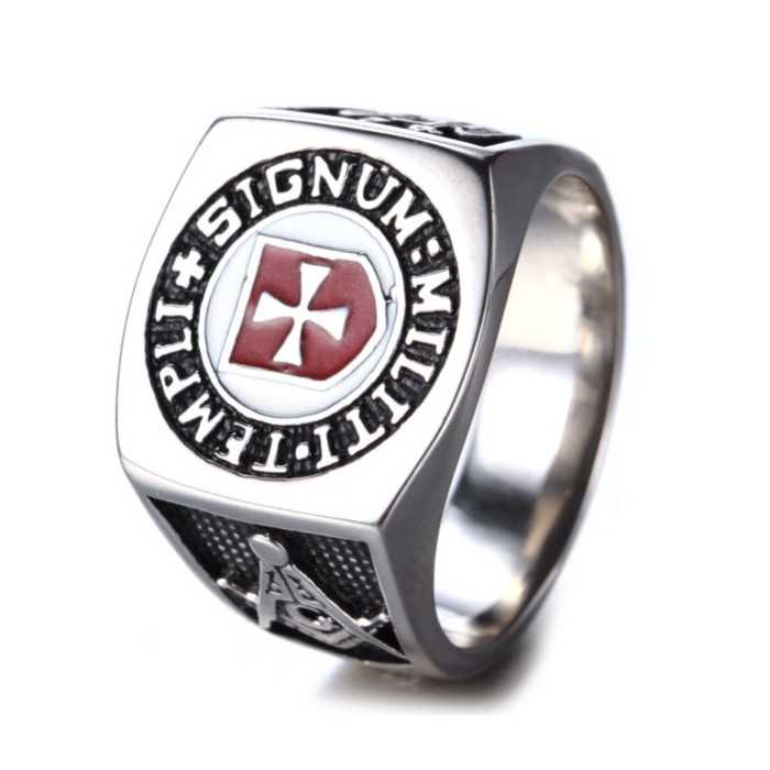 Bellissimo cavaliere in acciaio inox decorato nel suo centro con una croce di malto rossa, in uno scudo rosso, circondato da una citazione dall'ordine dei templari: "Templi Signum Militi". Due simboli su ogni lato completano questo modello, uno è il simbolo franco massonico con la piazza, la bussola e G e l'altro il simbolo dell'aquila a due teste. Questi due simboli completano la linea estetica di questo cavaliere portandolo un volume aggiuntivo.