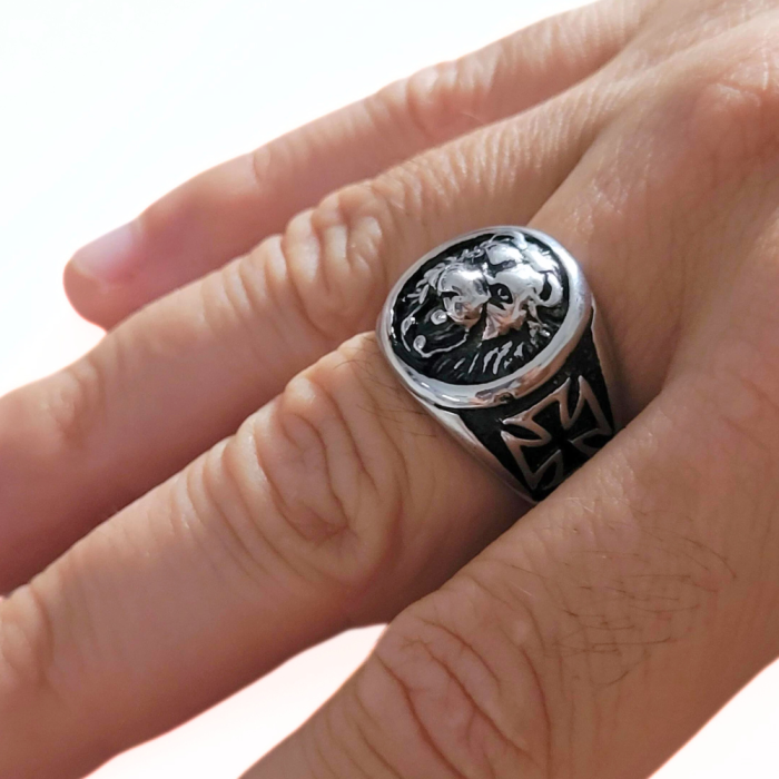 Anello in acciaio massiccio Maltese Testa di leone Celtico indossata da un uomo