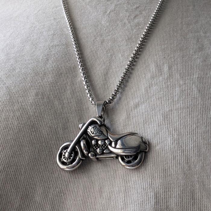 Ciondolo moto Acciaio inossidabile originale in forma realistica di motocicletta su sfondo annerito sublimato da registrazioni HD per Harley davidsonaccompagnato da una catena stilizzata inclusa.