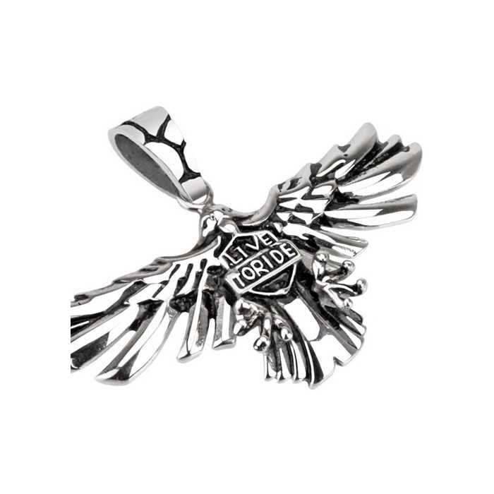 Un ciondolo a forma di aquila che distribuisce le sue ali in acciaio lucido e annerito, il tutto in rilievo. Nel cuore dell'aquila, un'iscrizione nera che indica "Live to ride" è ben nota per biker e proprietari di Harley Davidson. Sul montone, c'è una bella croce. Un gioiello davvero unico per lei.