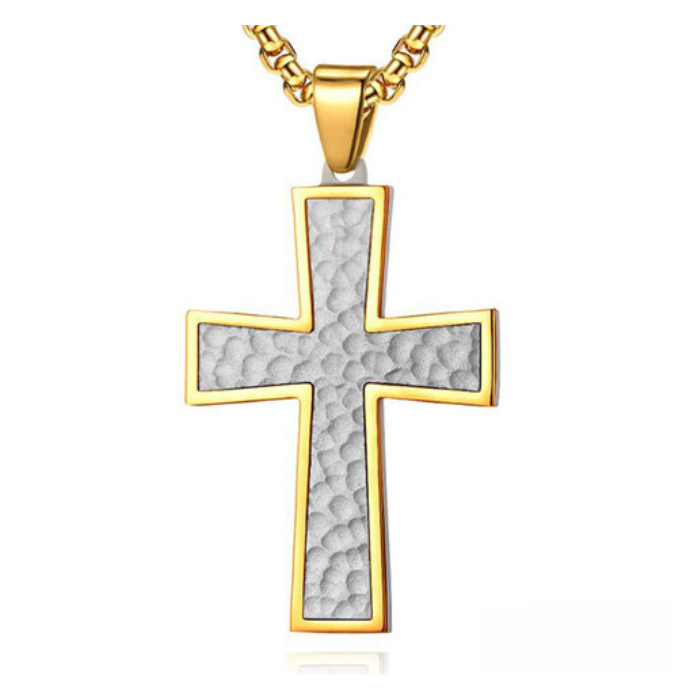 Collana con ciondolo da uomo e catena con croce in acciaio martellato color oro fino