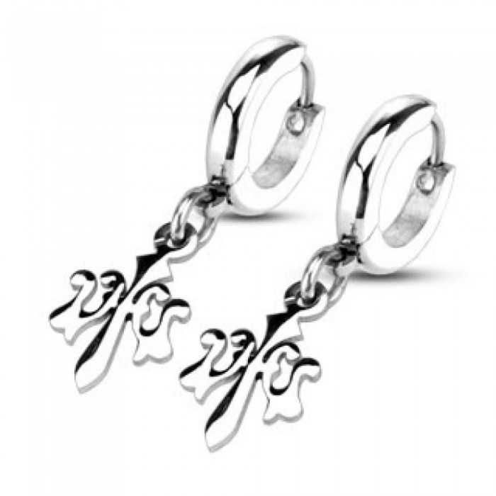 Coppia di orecchini per orecchie forate con ciondolo, acciaio estremamente lucido, bianco brillante, con riflessi mutevoli come uno specchio. Uno stelo, leggermente arcuato, collega i due anelli spessi, divisi in due. Il durante rappresenta un fiore di Lys sospeso a due raggi interlacciati. Chiudono con una semplice pressione sul fusto che rende facile posare e garantisce affidabilità al gioiello. Un gioiello di classe offerto a piccolo prezzo.