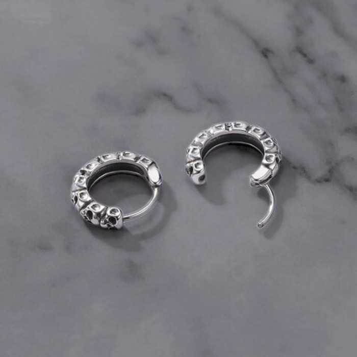 Immergiti nell'eleganza oscura del nostro Orecchini creoli Testa morta multiple, meticolosamente realizzato in acciaio inossidabile con un'elegante finitura argento. Loro Aperto a metà sulla cerniera che è collocata nel mezzo dell'anello, la posa è quindi ultra-facile e Chiudi dalla semplice pressione.