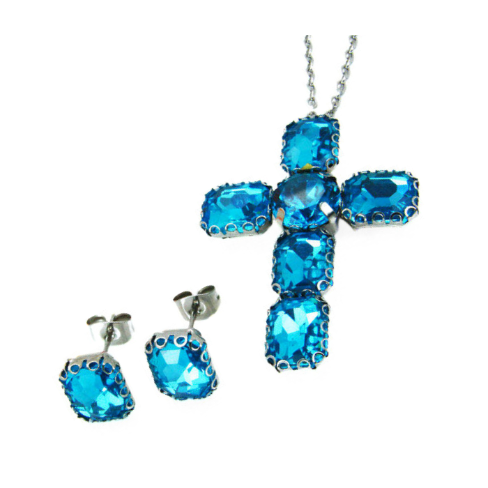 Ecco un bel design in acciaio inox che contrasta perfettamente con il brillante dei cristalli blu turchesi con effetto diamante. Infatti, questa perla à ̈ costituita da una catena fine con una maglia che costringe a indossare in una rasatura di collo, un ciondolo a forma di croce e orecchini.
