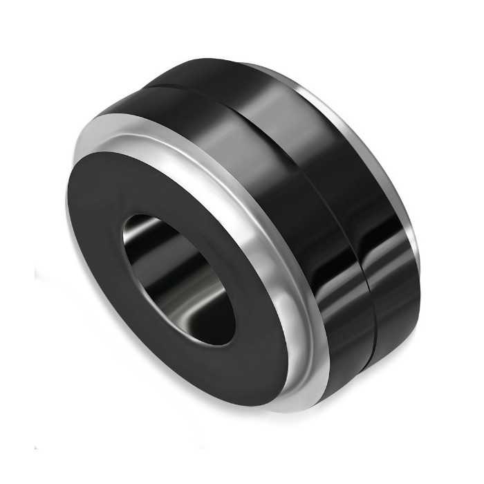 Superbe pendentif masculin bicolore en bel acier poli très épais, ressemblant à un écrou. L'écrou avec placage noir ionisation est vraiment original du fait qu'il tourne sur lui-même.