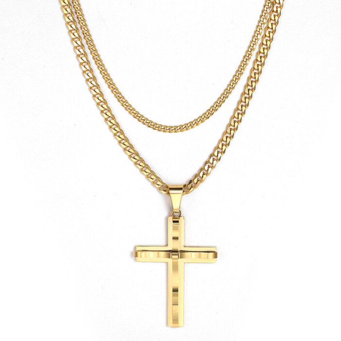 Veuillez noter que cet ensemble comporte un pendentif croix accompagné d'une chaîne cubaine d'une largeur de 5mm et d'une longueur de 60cm ainsi qu'une chaine cubaine d'une largeur de 3mm et d'une longueur de 55cm. L'ensemble est visible en photo portée par notre mannequin homme. Les chaines disposent d'un fermoir sécurisé à mousqueton qui les maintiendront en toute sécurité autour de votre cou.